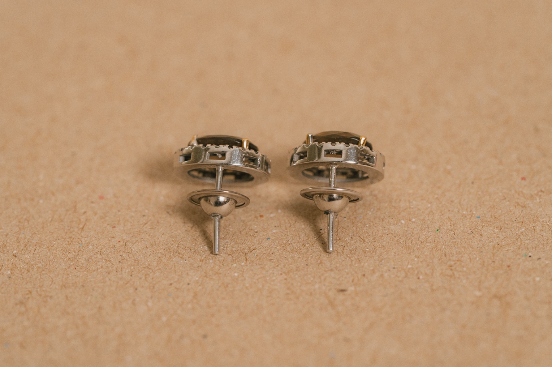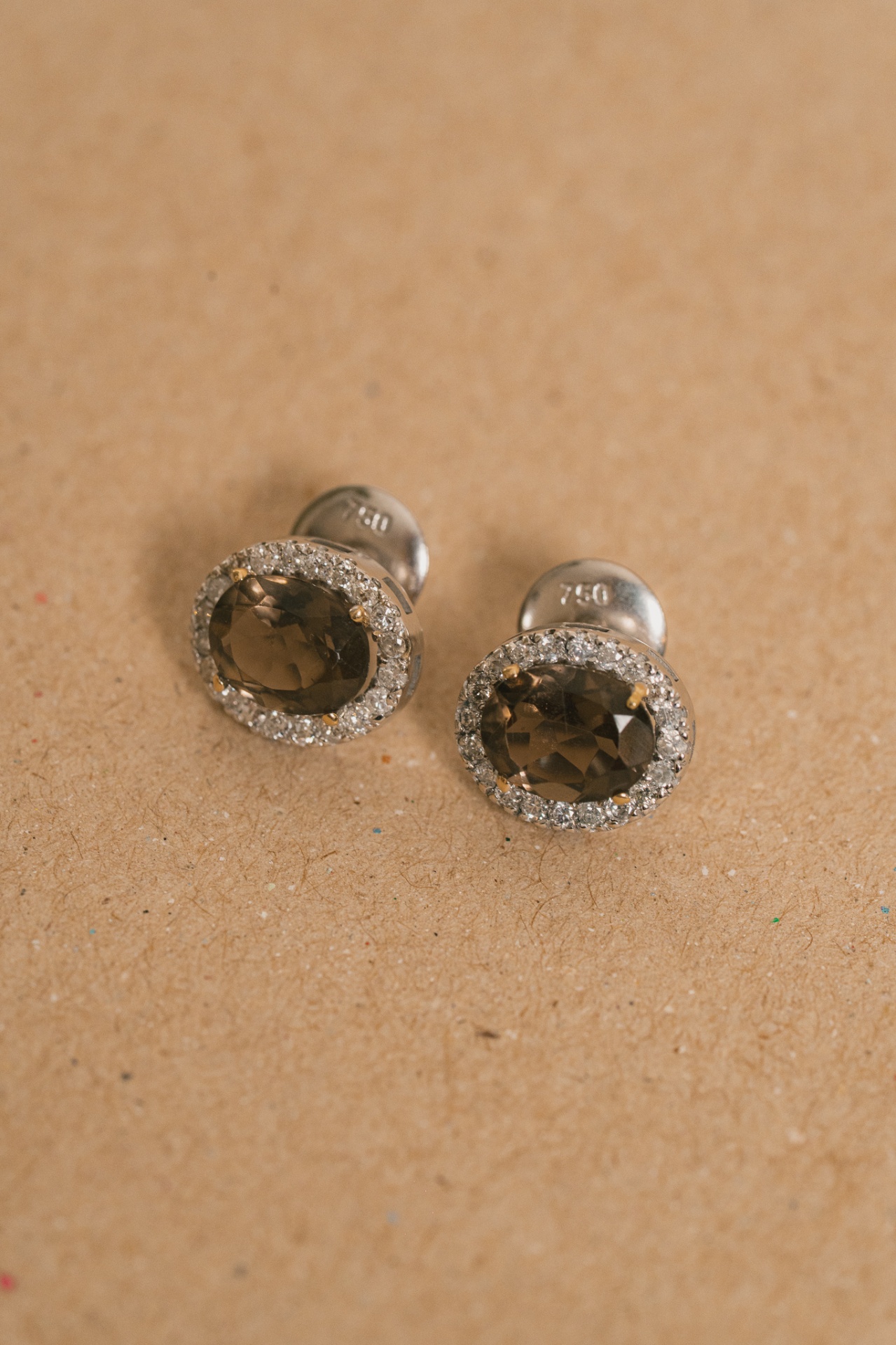 Brinco em ouro branco com quartzo fumê e diamantes.